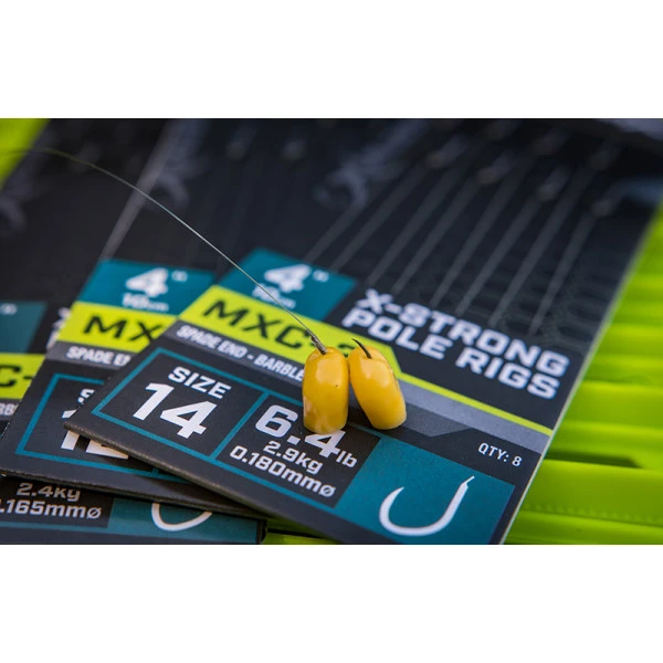 De Matrix MXC-2 X-Strong Pole Rig Barbles onderlijnen zijn voor de vaste stok voor het vissen op commerciële wateren. De onderlijnen zijn gemaakt met ultrascherpe MXC-2 PTFE gecoate haken en Power Micron mono. Verder zijn de onderlijnen nauwkeurig geknoopt op een lengte van 10cm voor een perfecte opslag in Matrix onderlijn cases. Ideaal voor gebruik met groter aas, zoals pellets, zoete maïs, lunchworst en deeg.